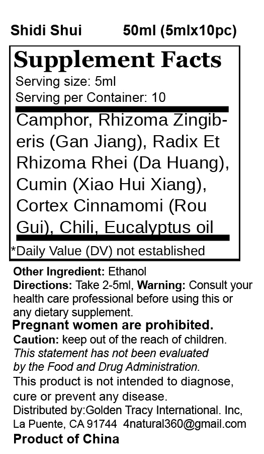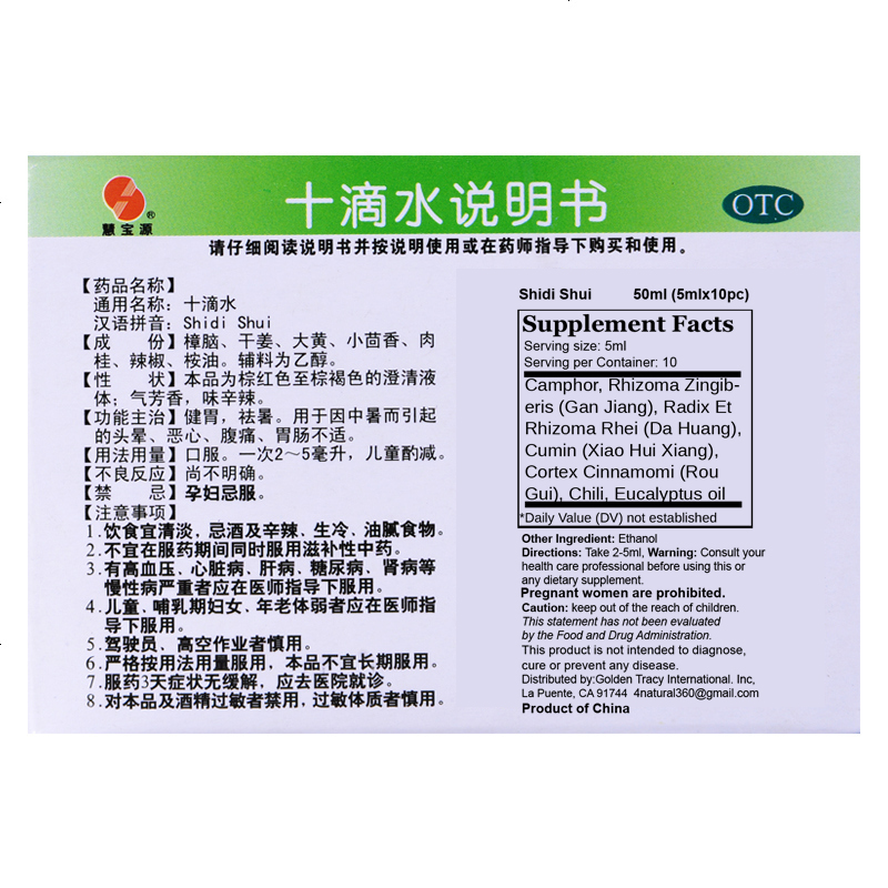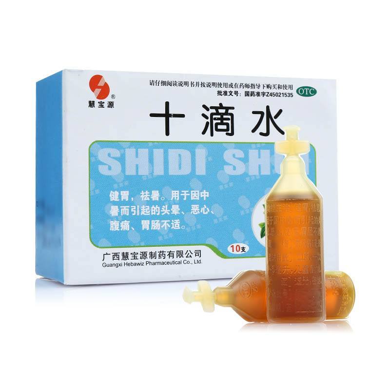 十滴水,中成药 [3]  。为祛暑剂,具有健脾、祛暑功效。用于伤暑引起的头晕、恶心、腹痛、胃肠不适。