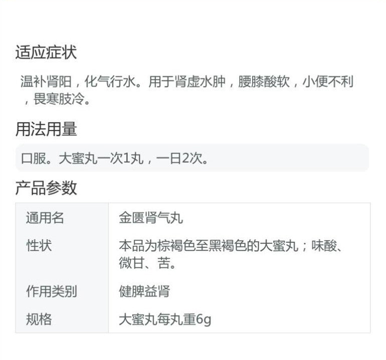 温补肾阳,化气行水。用于肾虚水肿,腰膝酸软,小便不利,畏寒肢冷。