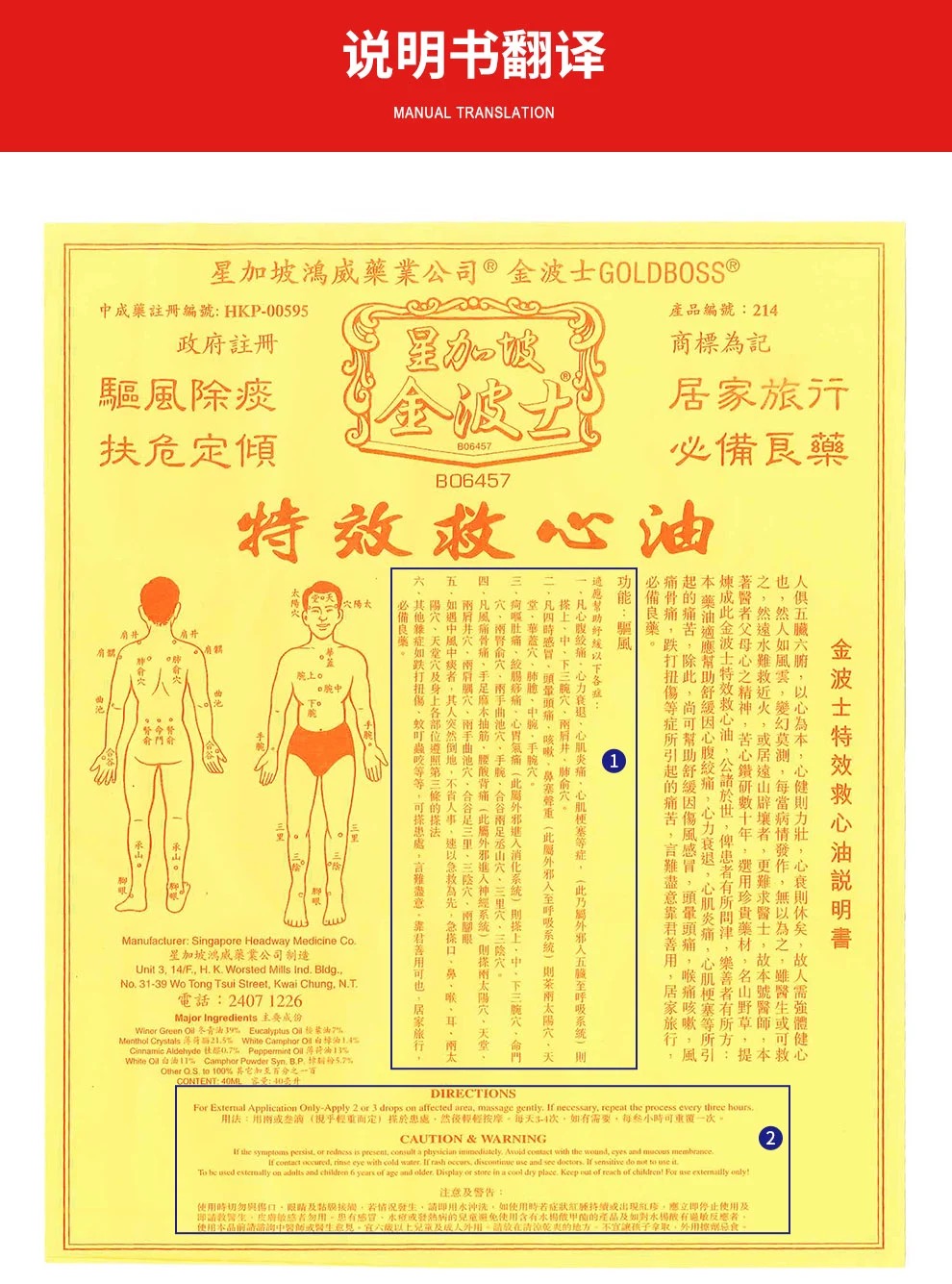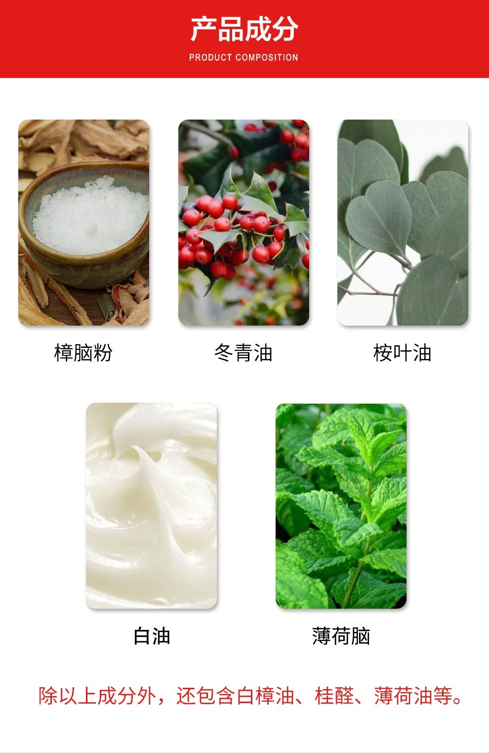 Winer Green Oil 冬青油 39% , Eucalyptus Oil 桉叶油 7%, Menthol Crystals 薄荷脑21.5% , White Camphor Oil 白樟油l.4% , Cinnamic Aldehyde 桂醛0.7%, Peppermint Oil 薄荷油 13% , White Oil 白油 11%, Camphor Powder Syn. B.P.樟脑粉5.7%, Other Q.S. to 100%其它加至百分之一百