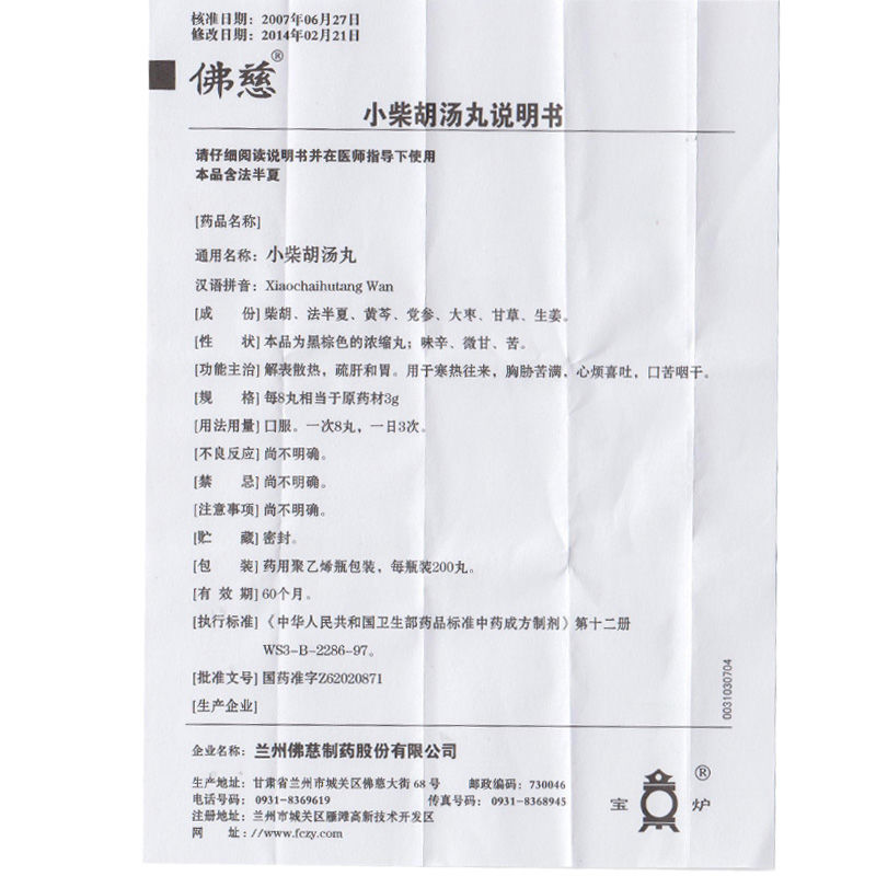 主要成份】柴胡、法半夏、黄芩、党参、大枣、甘草、生姜。 【性状】本品为黑棕色的浓缩丸,味辛、微甘、苦。 【功能主治/适应症】解表散热,疏肝和胃。用于外感病,邪犯少阳证,症见寒热往来、胸胁苦满、食欲不振、心烦喜呕、口苦咽干。 【用法用量】口服。一次8丸,一日3次。 【注意事项】1.忌烟、酒及辛辣、生冷、油腻食物。2.不宜在服小柴胡汤丸期间同时服用滋补性中药。3.风寒感冒者不适用。4.糖尿病患者及有高血压、心脏病、肝病、肾病等慢性病严重者应在医师指导下服用。5.儿童、孕妇、哺乳期妇女、年老体弱者应在医师指导下服用。6.发热体温超过38.5℃的患者,应去医院就诊。7.服药3天症状无缓解,应去医院就诊。8.对本品过敏者禁用,过敏体质者慎用。 【药物相互作用】如与其他药物同时使用可能会发生药物相互作用,详情请咨询医师或药师。 A botanical formulation containing seven herbs traditionally used to treat liver and GI disorders. In animal models, it prevents liver injury and promotes liver regeneration by inhibiting lipid peroxidation in hepatocytes and hepatic stellate cells. In humans, it prevents progression of cirrhosis to HCC and increases survival of those with chronic viral hepatitis by reducing progression to HCC. Contraindication with IFN therapy because of increased risk of pneumonitis; Sho-Saiko-To may cause acute hepatitis. Thus its use in patients with liver disease is not recommended. Xiao Chai Hu Tang Wan contains codnopsis root, which is a perennial herb that grows in Asia. It is the taproot of this plant that is most prized as an ingredient in many herbal formulas. This root has gained a strong reputation over hundreds of years as an important herb for supporting optimal health and energy. During ancient times, this root was used mostly to support the health of the lungs. Also, people used codnopsis root to support their digestive system. Today, the herb is helpful for people who are suffering from gas, bloating, loss of appetite or nausea. This root also has a valuable role today in supporting the health of the immune system and the production of healthy red blood cells. Codnopsis root is similar to ginseng, which is usually more expensive. Overall, the herb is prized for its ability to support overall body health.