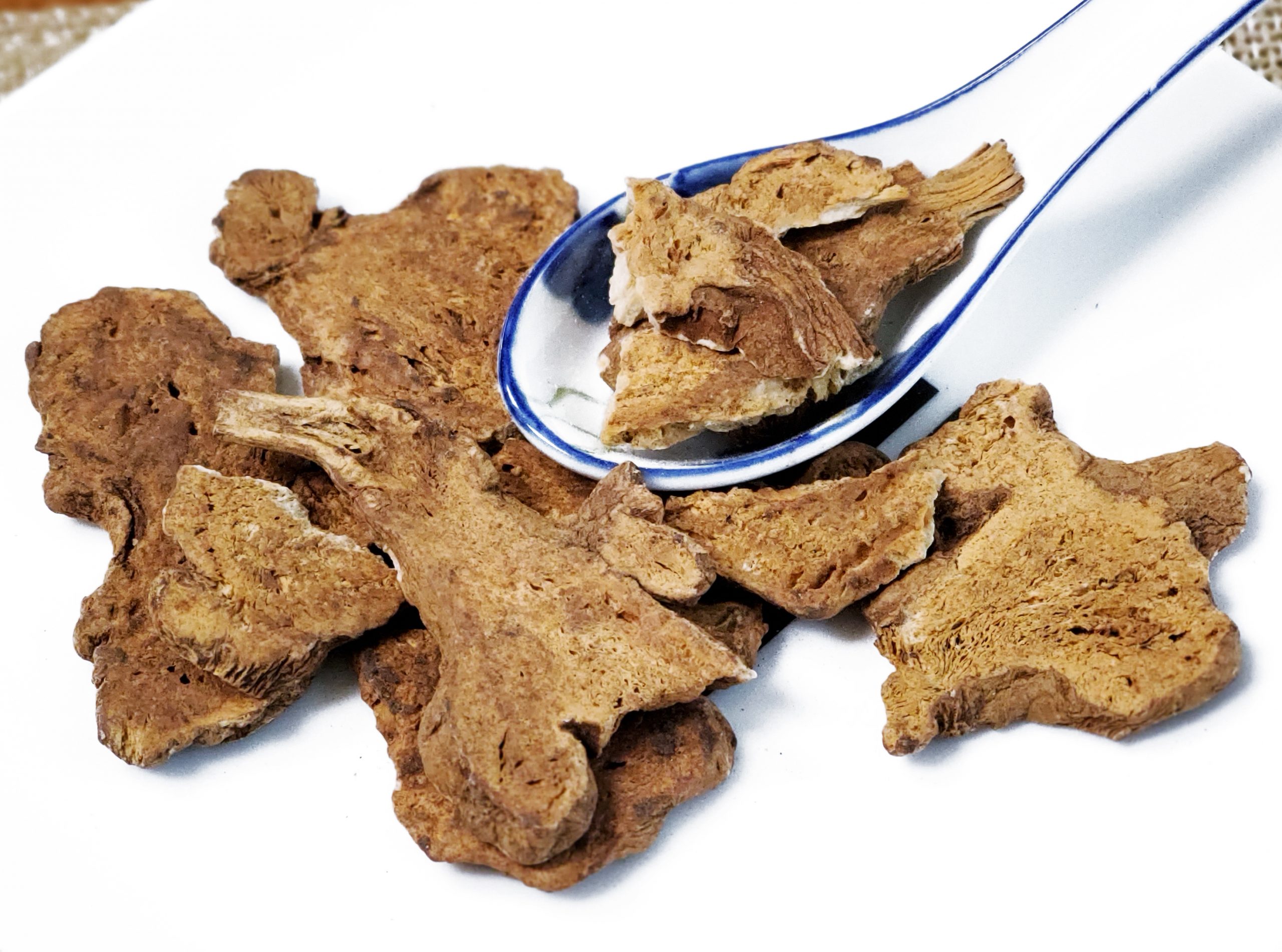 为菊科多年生草本植物白术的根茎。根茎规则的肥厚团块。质坚硬,不易折断,气清香,味甘、微辛,嚼之略带黏性。别名:桴蓟,于术,冬白术,淅术,杨桴,吴术,片术、苍术