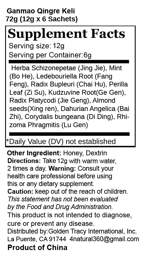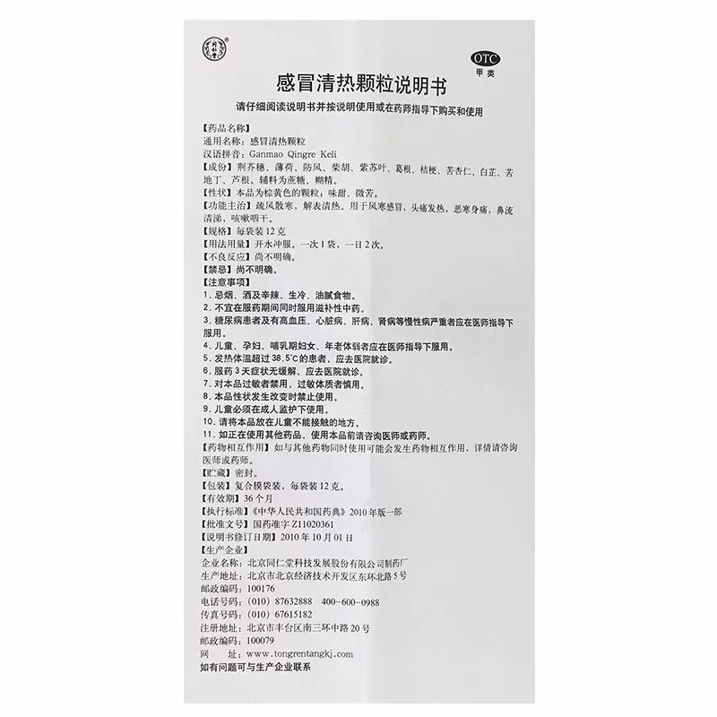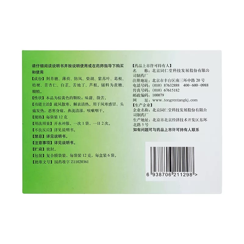 Tongrentang 感冒 清热 颗粒 Ganmao Qingre Keli 12g x6Bags