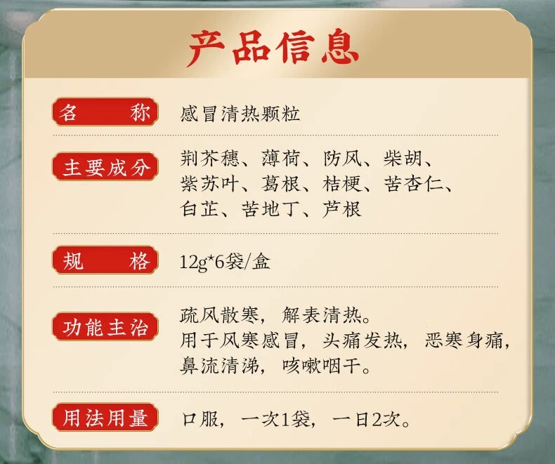 用于风寒感冒,头痛发热,恶寒身痛,鼻流清涕,咳嗽咽干。