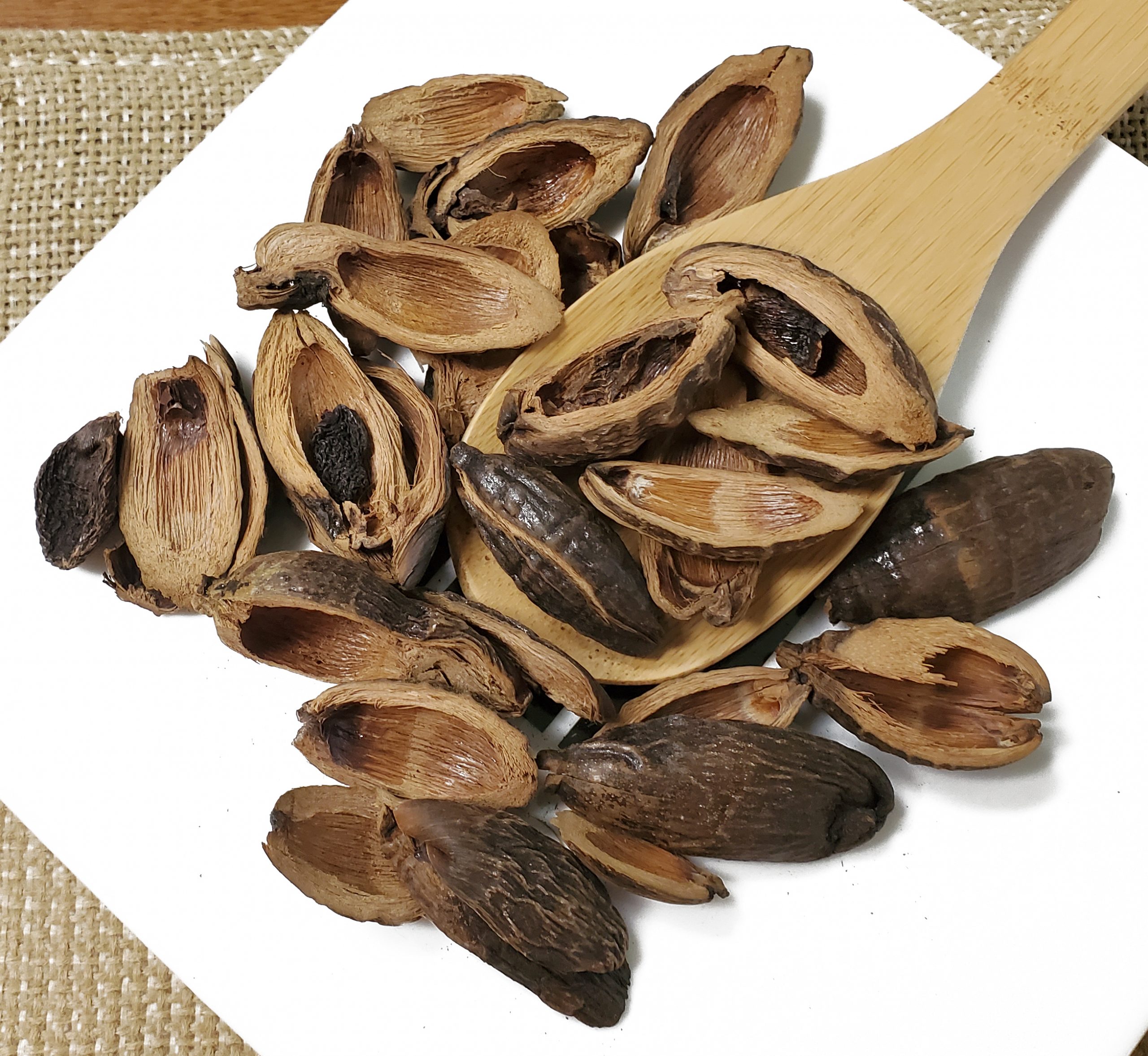 The Chinese Herb Da Fu Pi is the dried husk or peel of the areca nut. The areca nut itself is the seed (encased in fruit) of the areca (or betel nut) palm tree (Areca catechu L.). The areca palm tree is thought to have originated in the Philippines but now is naturalized all over Southeast Asia and the Pacific; in China it predominantly grows in Guanxi, Yunnan, and Hainan provinces. The seeds are harvested from the fruit and then boiled in water and dried—then the peel (Da Fu Pi) is removed from the seed. The seed (minus the peel) is the Chinese herb Bing Lang.