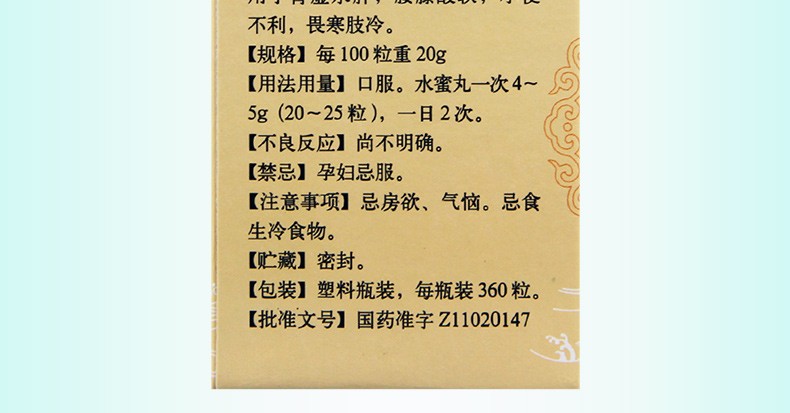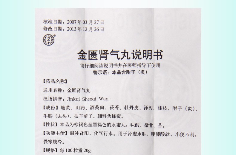 Jin Kui Shen Qi Wan can tonify the kidney qi and mingmen (the gate of life), and replenish kidney yang with warm-nature herbs. It is used to treat the insrfficiency syndrome of kidney yang marked by lumbago, pedal flaccidity, cold sensation in the lower part of the body, cpasm in the lower abdomen, dysuria or polyuria, weak and small pulse in the chi part, pale and enlarged tongue with thin and white fur. Also for beriberi, phiegmatic retention, bladder colic.