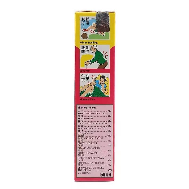 Good for Swelling and pain from bruises, itchy skin, bleeding from knife wounds, burns from soups and cannons, mosquito bites, muscle and bone numbness and pain caused by new and old injuries.