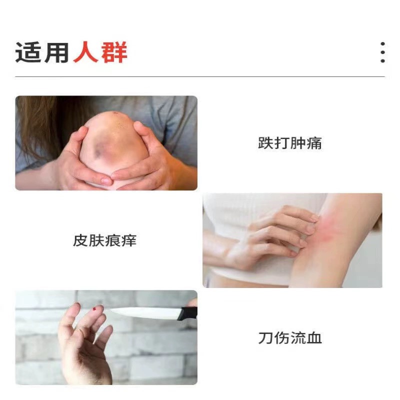 跌打肿痛,皮肤痕痒,刀伤流血, 汤火炮烙, 蚊叮虫咬,新伤旧患之筋骨痹痛。