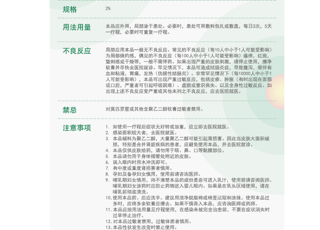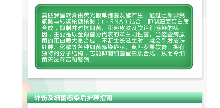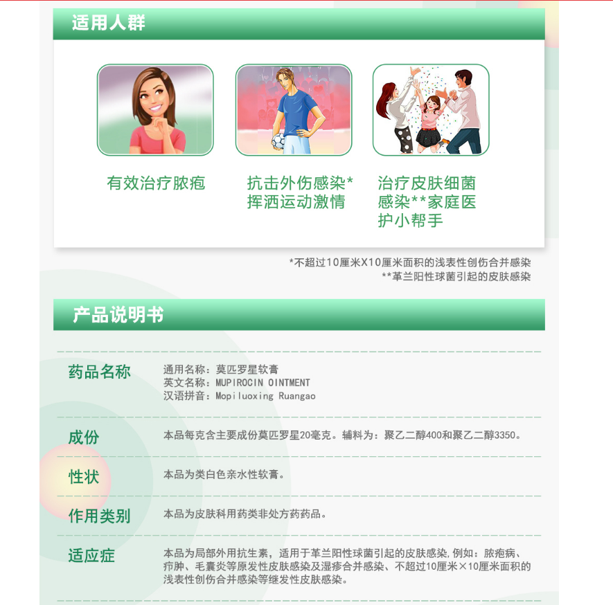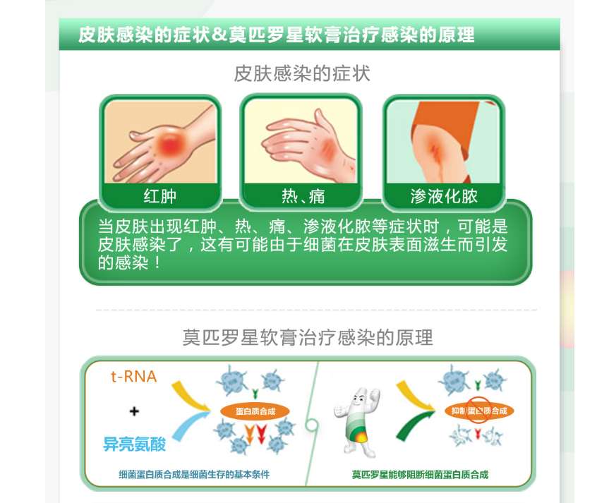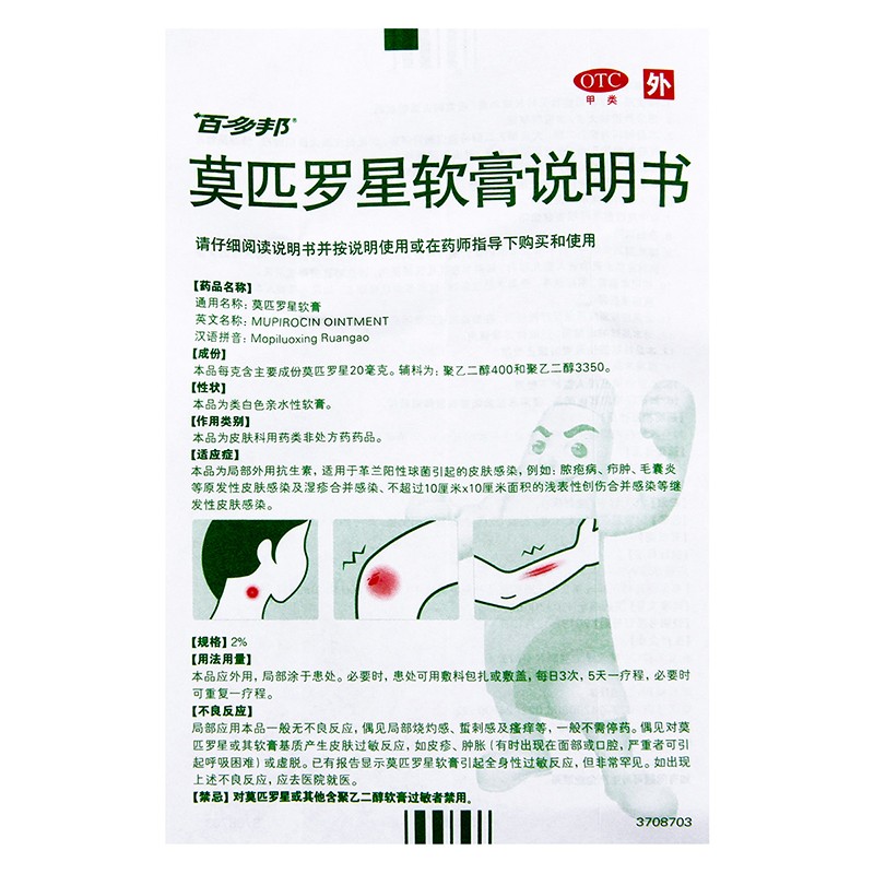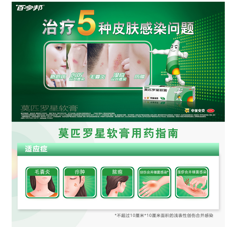 百多邦®软膏为外用抗生素,主要成分是莫匹罗星,适用于革兰阳性球菌引起的皮肤感染,例如:脓疱病、疖肿、毛囊炎等原发性皮肤感染及湿疹合并感染