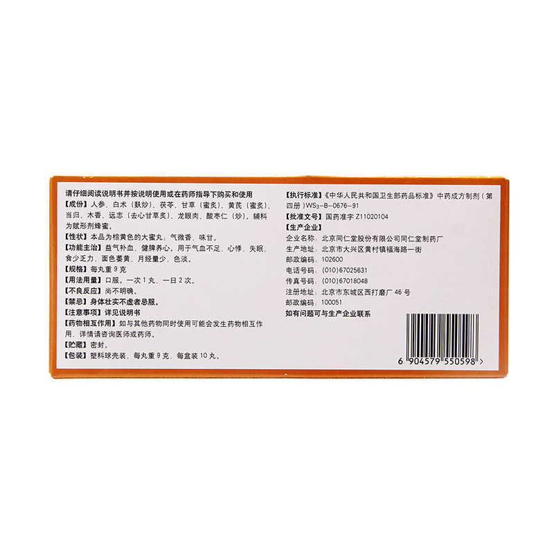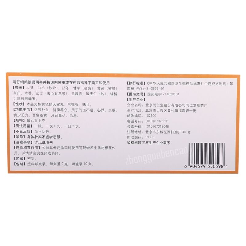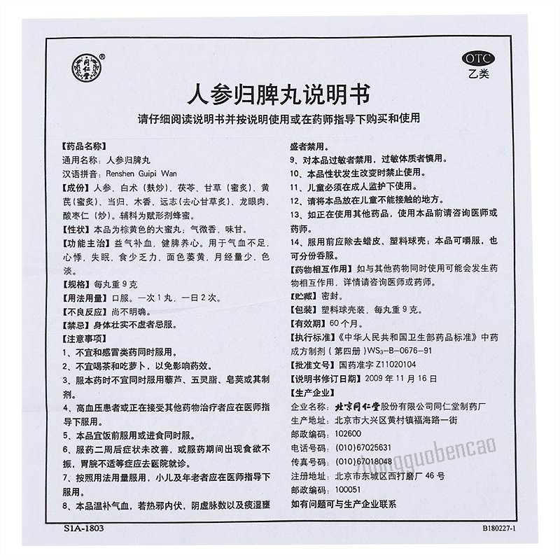 Ren Shen Gui Pi Wan Ingredients: natural extract of ginseng (rens hen), coconut pore (fu ling), root of licorice (gan cao), carnivorous root (huang qi), root of Chinese angelica (dang gui), saussurelopodlike root (mu xiang), longana flesh (long yan rou), thin-leafed root (yuan zhi), zyphus seed (suan zao ren), rhizome of atraktylodes large-sized (bai zhu).