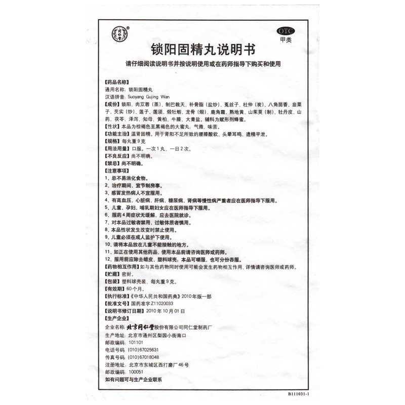 同仁堂 锁阳固精丸 Tongrentang Suoyang Gujing Wan 10 Pills