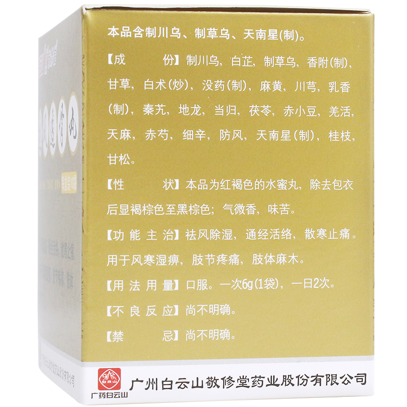 【功能主治/适应症】祛风除湿,通经活络,散寒止痛。用于风寒湿痹,肢节疼痛,肢体麻木。